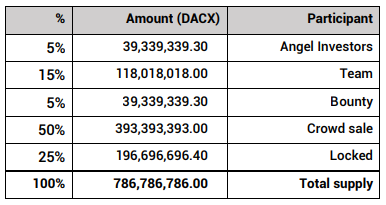 5% of the tokens are for the angel investors, while 15% goes to the team. 5% of the total amount of the DACX token serves as bounty while 50% is meant for crowd sales. The last 25% of the tokens is locked. The team members will get their tokens monthly from the launch of the DACX platform.
